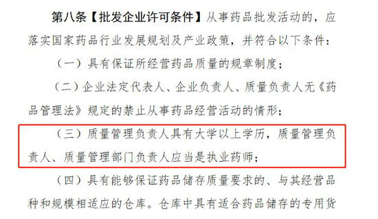 在《药品经营监督管理办法(征求意见稿)》中的第八条明确指出:药品批发企业的质量管理负责人须具有大学以上学历,质量管理负责人/质量管理部门负责人应当是执业药师。