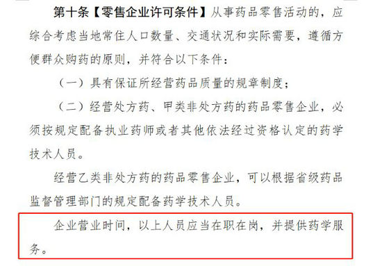 办法中强调,在企业营业时间,规定配备的药学技术人员应当在职在岗,并提供药学服务。