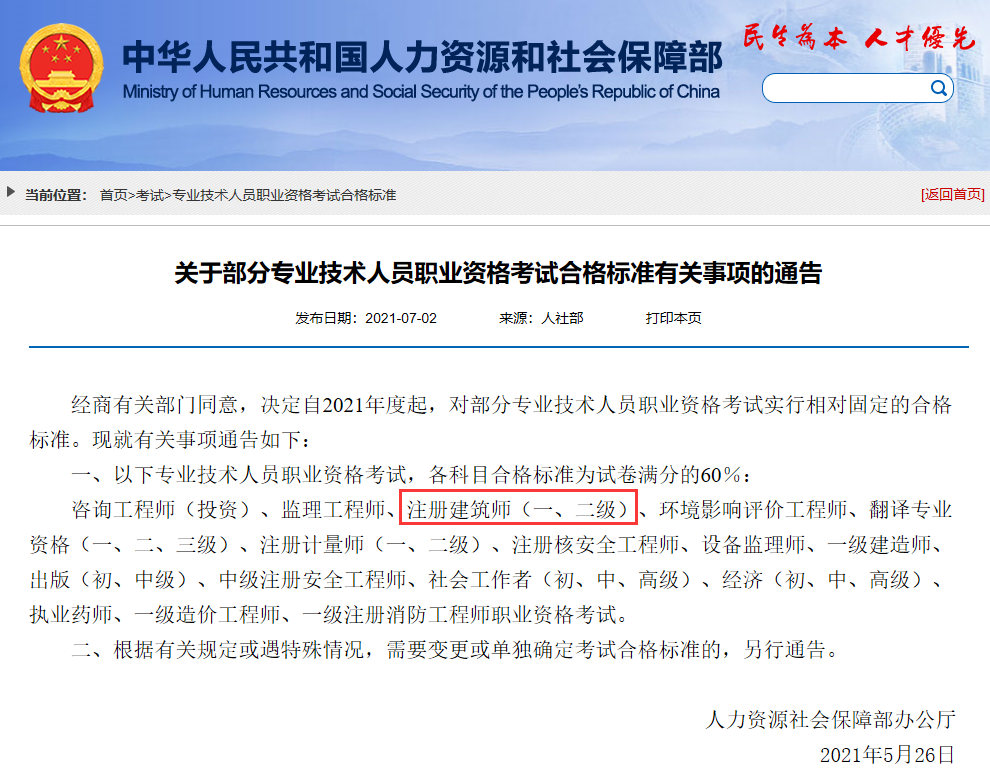 人社部官宣:自2021年起,一级注册建筑师合格标准固定自2021年起,一级注册建筑师合格标准固定,为满分的60%。下面就是为大家带来《关于部分专业技术人员职业资格考试合格标准有关事项的通告》。各位考生快来了解一下。